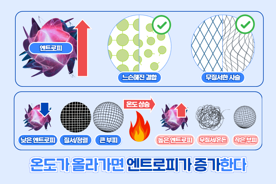 이러한 현상은 ‘엔트로피’로 설명할 수 있는데요. 열역학 2법칙에 따르면 물체는 열이 오르면 무질서도, 즉 엔트로피가 증가합니다. 엔트로피가 증가한다는 것은 결합이 느슨해지거나 사슬이 어질러져 무질서한 상태가 된다는 것이죠.