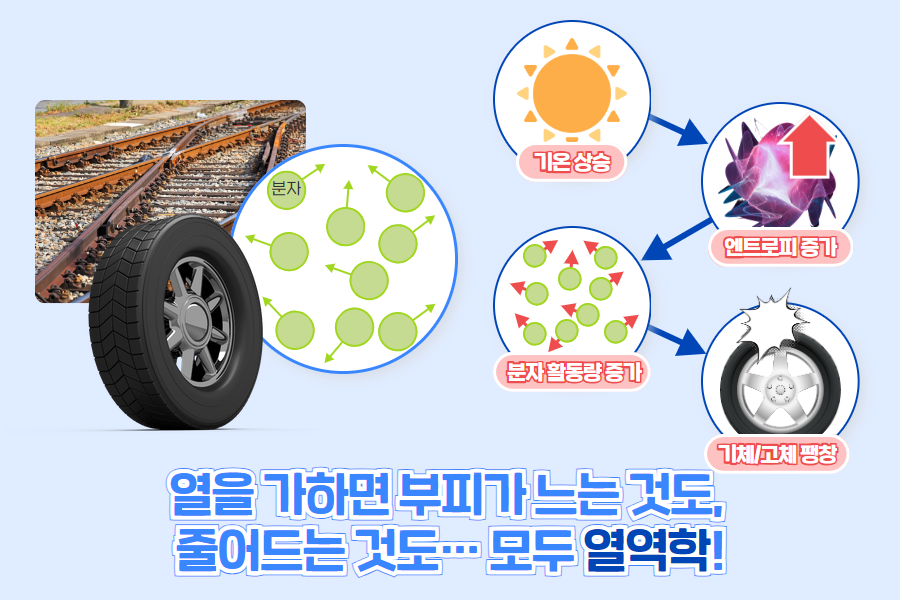 위의 내용을 보다 보면, 열팽창과 관련한 궁금증을 가질 수도 있는데요. 여름철 빵빵해지는 타이어, 부피가 커져 어긋나는 철도 선로 등은 엔트로피와 관계가 없는 것일까요?