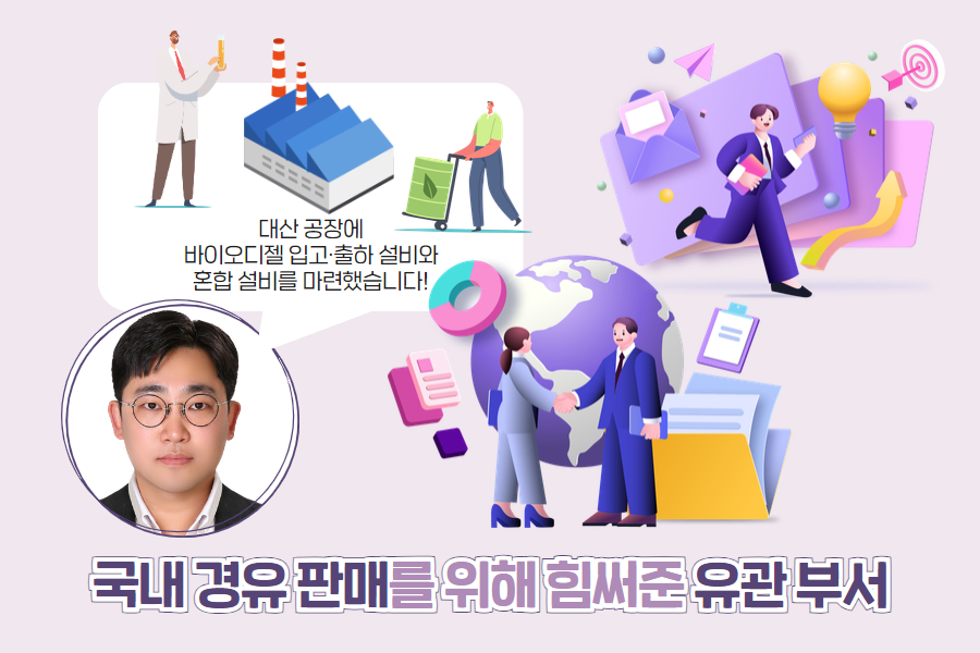 과거 설비 부재로 인해 제한적으로 판매해 온 국내용 경유 제품의 판매 인프라를 확대하기 위해 여러 방면으로 노력을 했는데요. 대산공장 내 바이오디젤 입고 설비와 혼합·출하 설비를 마련해 내수 경유 공급의 지속성을 확보할 수 있었습니다. 곧 국내 경유 판매를 재개하게 되었구요.