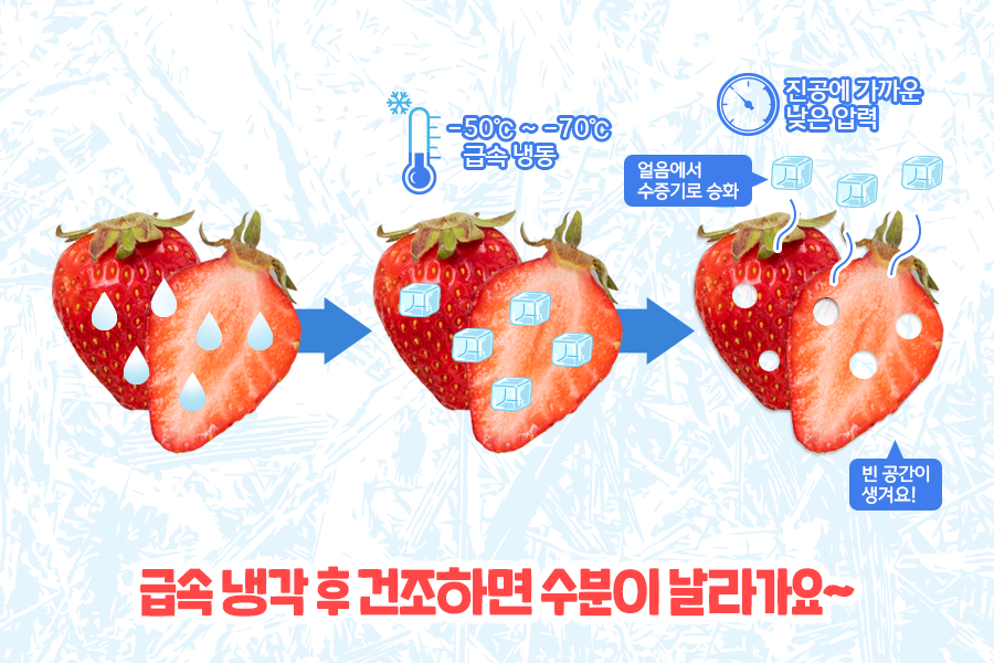 물질의 상태 변화에 대해 알았다면, 이제 동결건조가 어떤 원리를 사용했는지 알 수 있습니다. 동결건조는 말 그대로 ‘동결-건조’의 과정을 거치는 기술인데요. 식품을 -50℃에서 -70℃의 낮은 온도에서 급속 냉동을 하면 식품 속 수분이 그대로 얼어 붙습니다. 얼린 식품을 진공에 가까운 압력으로 낮춘 뒤 건조하면 얼음이 된 수분이 액체인 물을 거치지 않고 바로 수증기가 되죠.