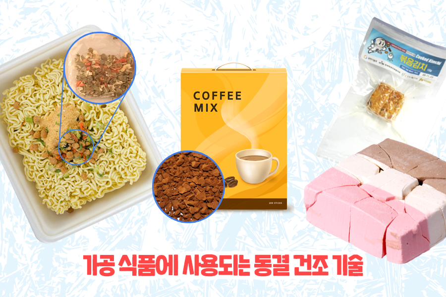 라면과 마찬가지로 믹스 커피 등에 들어있는 알커피 역시 커피를 동결건조한 식품이며 각종 과일 칩 등도 동결건조를 이용한 식품 입니다.