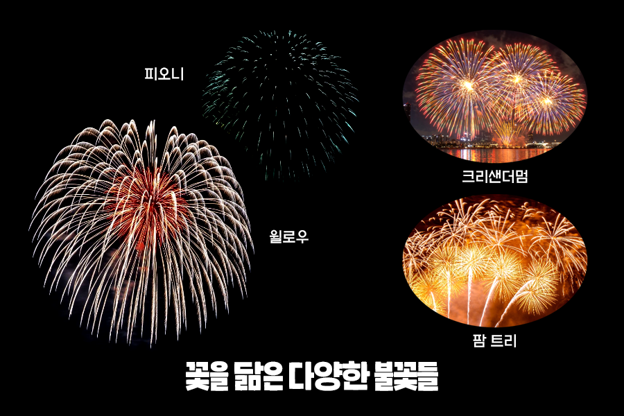 이 외에도 굵은 기둥에 불꽃이 야자수잎처럼 펼쳐지는 ‘palm tree(팜 트리)’, 버들나무 형태의 ‘willow(윌로우)’ 불꽃 등이 있습니다.