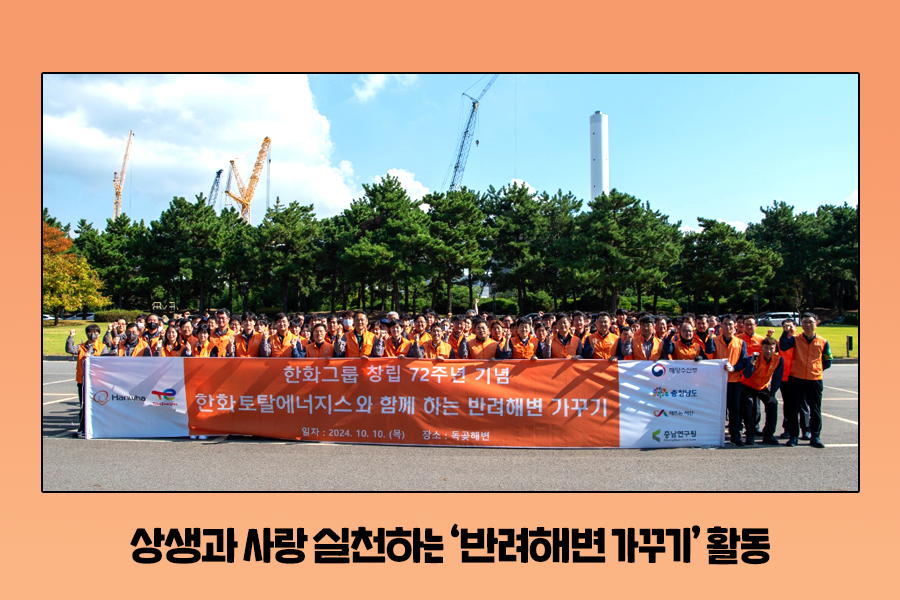 한화그룹과 한화토탈에너지스가 이만큼 발전할 수 있었던 것은 지역사회와 이웃, 공동체 구성원 등 많은 사람들의 보이지 않는 노력이 있었기 때문입니다. 창립기념일을 맞아 진행된 환경정화활동이 한화 그룹의 사회공헌 철학인 ‘함께 멀리’의 의미를 되새기고, 함께 걸어온 모든 분에 대한 감사함을 생각하는 계기가 되었으면 좋겠습니다. 앞으로도 한화토탈에너지스는 나눔과 상생의 의미를 깊게 새기고 더불어 성장해 나아가는 회사가 되도록 노력하겠습니다!