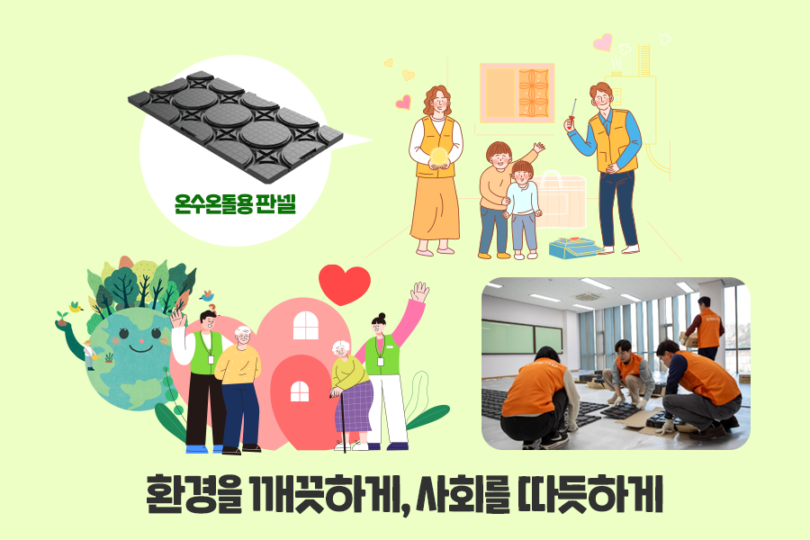 이번 사업의 종착지이자, 재활용 PP로 만들어질 최종 제품은 바로 ‘온수온돌용 판넬’입니다. 퍼즐식 조립으로 간편한 시공이 장점인 이 온돌 판넬이 왜 특별한 것일까요?