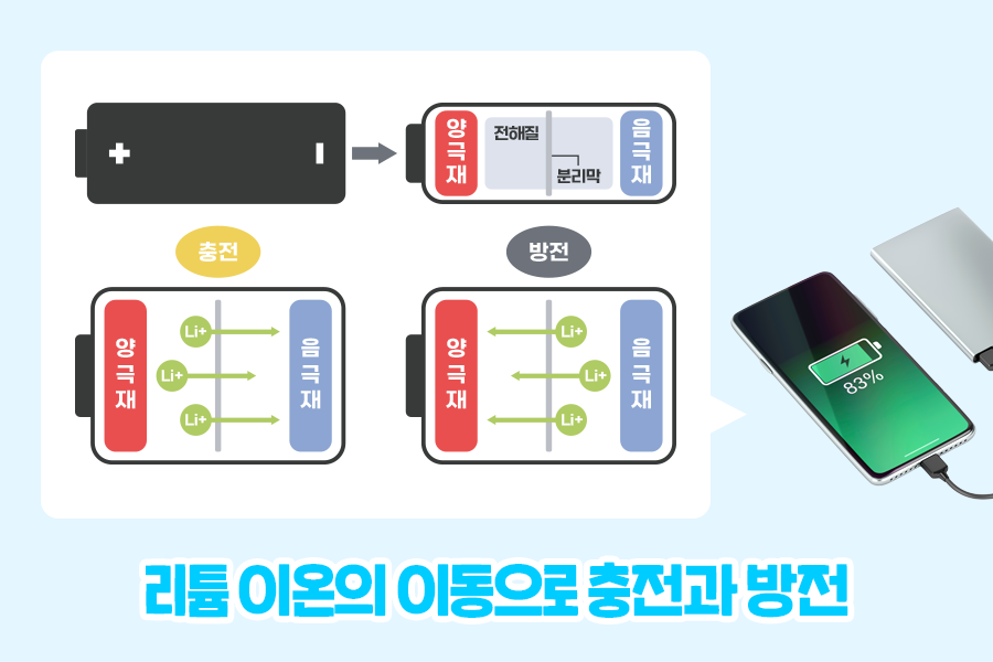 외부에서 전기 에너지가 들어오면 배터리의 양극재에 있던 리튬 이온이 전해질을 통해 음극으로 이동하며 전기 에너지가 충전 되는데요. 반대로 음극에 있던 리튬 이온이 원래대로 되돌아가는 과정에서 전기가 발생하고 방전이 일어납니다. 이렇게 생성된 전기는 다양한 전자제품을 움직이는 힘이 되죠.
