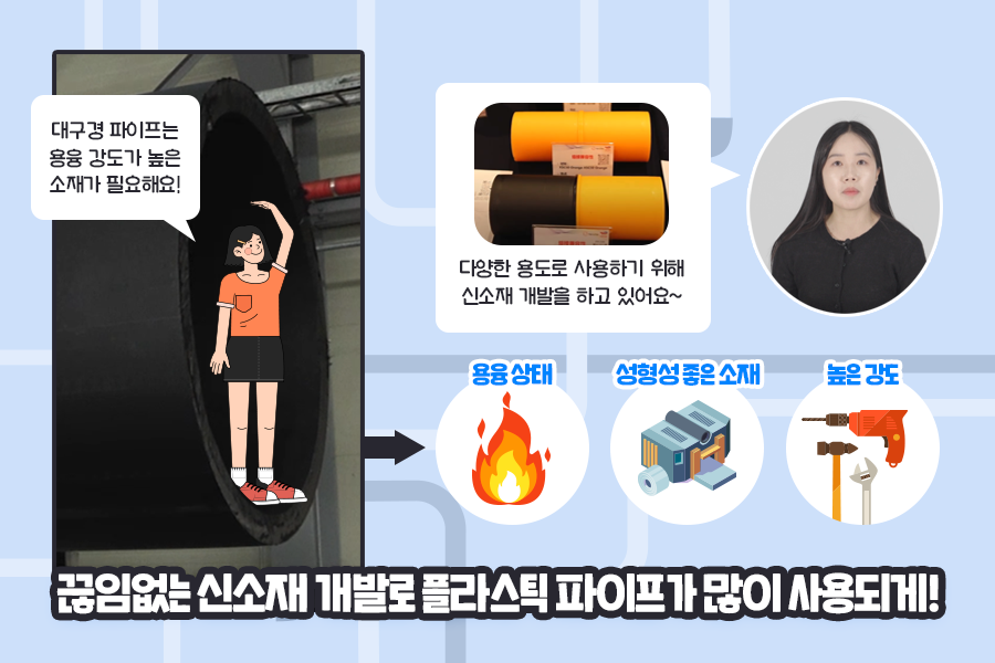 플라스틱 파이프가 50년 이상의 수명을 가지고 있다니, 한 번 HDPE 파이프가 사용되면 오랫동안 동파와 같은 파손 걱정은 없겠죠? 다양한 소재 개발로 파이프가 필요한 모든 곳에 양질의 플라스틱 파이프를 공급할 수 있게, 파이프의 변화를 지켜봐주세요~