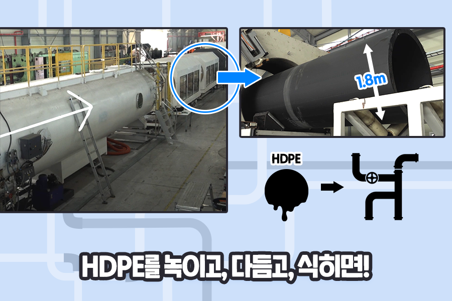 플라스틱 파이프를 만드는 것은 소재를 녹이는 것부터 시작되는데요. 파이프 소재인 HDPE를 녹여 원하는 파이프 모양으로 만들고, 기계를 사용해 앞으로 쭉 밀어냅니다. 밀어낸 파이프를 다듬고 식히면 우리가 사용하는 플라스틱 수도관 파이프가 완성되는거죠.