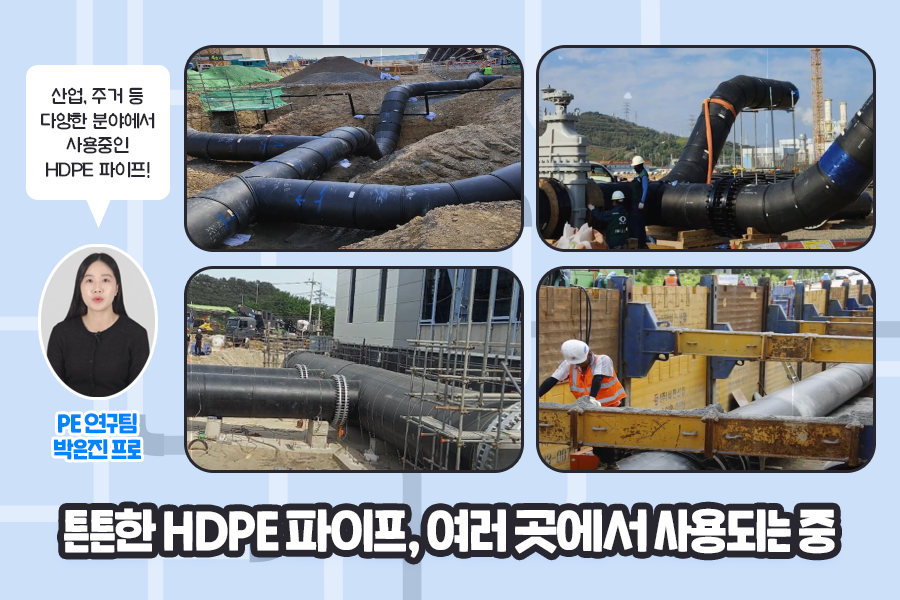 박은진 프로 : 안녕하세요, 한화토탈에너지스 PE연구팀 박은진 프로입니다. 플라스틱 수도관용 HDPE 파이프가 상용화되어 있는지 궁금하신가요? 정답은 ‘네’ 입니다. HDPE 파이프는 산업용, 광산용 그리고 하수관으로도 사용되고 있습니다. 주거시설에서는 내온수관용, 지역난방관용 등 많은 곳에 쓰이고 있죠.