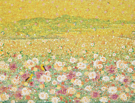 A. 작품을 감상할 때는 그림을 그린 화자의 의도를 알고자 하기보다는 그림을 봄으로써 느껴지는 감상자 자신의 감정이 더 중요하다고 생각해요. (웃음) 한 가지 묘미는, 각각의 그림 속에 새, 나비, 벌과 같이 다양한 생물들이 숨어 있다는 점입니다. 또 비가 꽃비로 올 때도 있고 물방울이나 점으로 표현될 때도 있으므로, 숨은 그림을 찾듯 그림마다 품고 있는 차이를 찾아보시면서 작품을 더욱 즐겁게 감상해 주시면 감사하겠습니다.