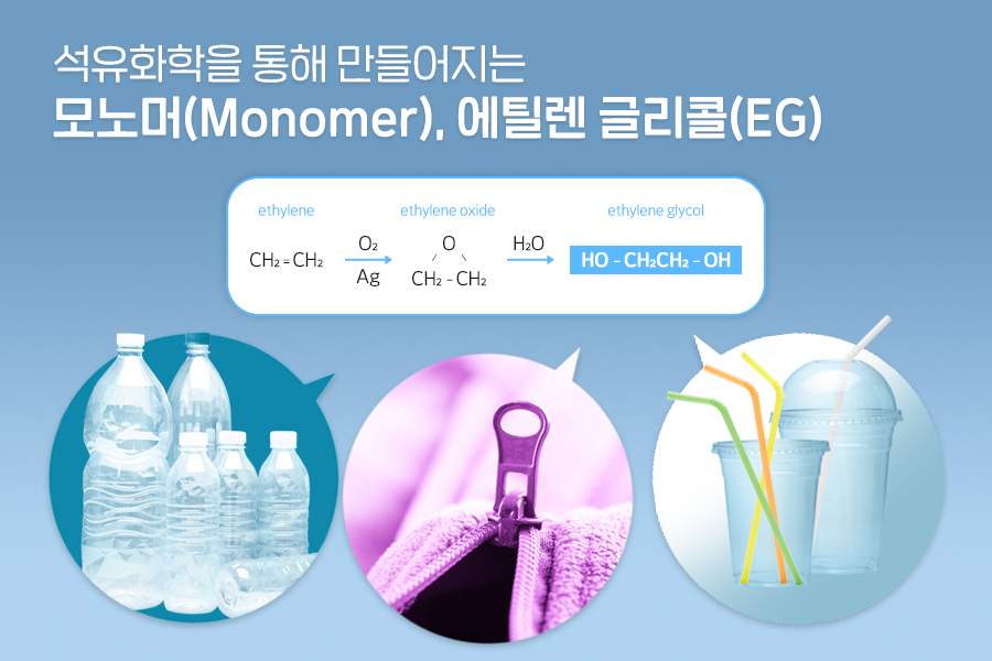 에틸렌 글리콜(EG)은 부동액에도 쓰이지만, 우리 일상에서 더 쉽게 볼 수 있는 플라스틱의 원료이기도 한데요. PET의 원료로 페트병뿐만 아니라 폴리에스터 섬유, 그리고 아이스 아메리카노를 담는 플라스틱 컵의 원료로도 쓰입니다.