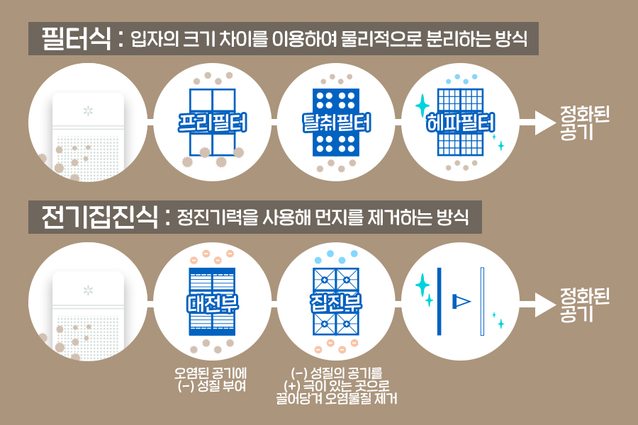최근에는 필터식과 전기집진식의 특성을 결합한 복합식 공기청정기가 대세를 이루고 있습니다.