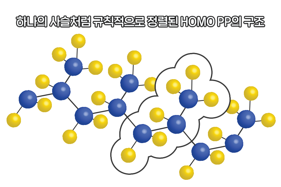 HOMO PP는 프로필렌이 하나의 사슬처럼 규칙적으로 정렬되기 때문에 강도가 높고, 내약품성, 내열성이 뛰어납니다. 다른 모노머와 섞인 공중합체(copolymer)와 비교하면, HOMO PP가 더 뻣뻣하고 단단한 특징이 있습니다.