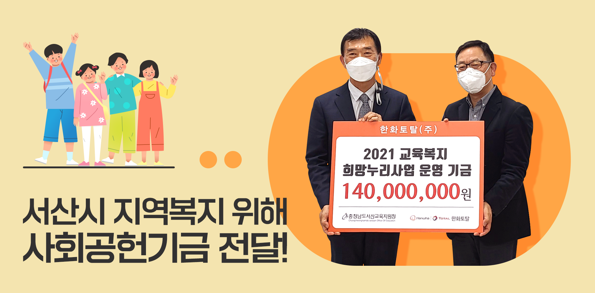 한화토탈은 또한, 지난 24일 충청남도서산교육지원청에 ‘교육복지 희망누리사업’ 운영 기금으로 1억 4천만 원을 전달했습니다. 해당 기금은 서산시의 저소득가정 학생들이 학교생활을 하는 데 필요한 동아리 활동비, 의료비, 긴급 생활비 등을 지원하는데 운영될 예정입니다.