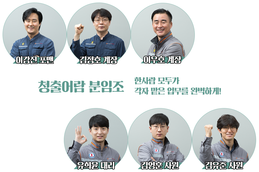 조원들 모두 각자 맡은 자리에서 열심히 잘하고 있어서 감사합니다. 아무래도 현장에서 많은 일을 하고 있는 김유준 사원이 분임조 막내로서 항상 궂은일을 도맡아 군말 없이 잘 수행해 주고 있는데요. 막내지만 든든하고 믿음직스러워 우리 분임조에 없어서는 안 될 그런 인물인 것 같습니다.