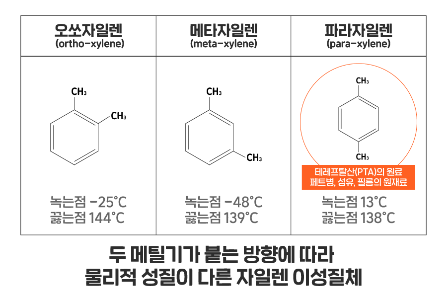 육각형 고리에 2개의 메틸기가 붙는 경우의 수는 3가지인데요. 바로 옆의 탄소에 메틸기가 붙는 오쏘(o-)와, 하나의 탄소를 건너뛰고 붙는 메타(m-), 그리고 두 개의 탄소를 건너뛰어 180°를 이루는 파라(p-) 자일렌이 만들어집니다. 세 자일렌은 분자 구조가 차이나는 만큼 물리적 성질도 다른데요. 세 물질의 녹는점 차이가 각각 -25℃, -48℃, 13℃로 거의 판이하게 다릅니다. 이 세 자일렌 중, 우리가 오늘 집중해서 볼 소재는 파라자일렌(para-xylene)이랍니다!