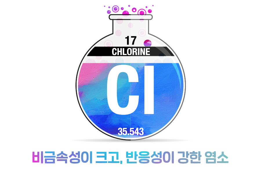 원자번호 17번 원소인 염소는 이원자 분자인 Cl2 형태의 녹황색 기체입니다. 자연의 상태에서는 화합물로만 존재하는데, 우리가 흔히 알고 있는 소금(NaCl)이 그 대표적인 예시입니다.