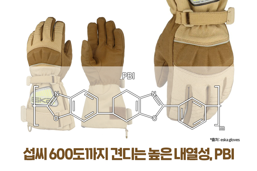 불과 열에 강한 또 다른 소재로 PBI가 있습니다. PBI는 폴리벤즈이미다졸(polybenzimidazole)의 줄임말인데요. PBI는 섭씨 600도 이상까지 견딜 수 있어 상업용 고분자 중에서 가장 높은 내열성능을 가지고 있다고 알려져 있습니다. PBI는 안정성과 내화학성이 뛰어나 방화복, 방화장갑 등 화재진압용 소재로는 최고입니다. 하지만, 그만큼 소재 가격이 비싸고 가공하기가 어려워 많이 사용하기는 힘듭니다.