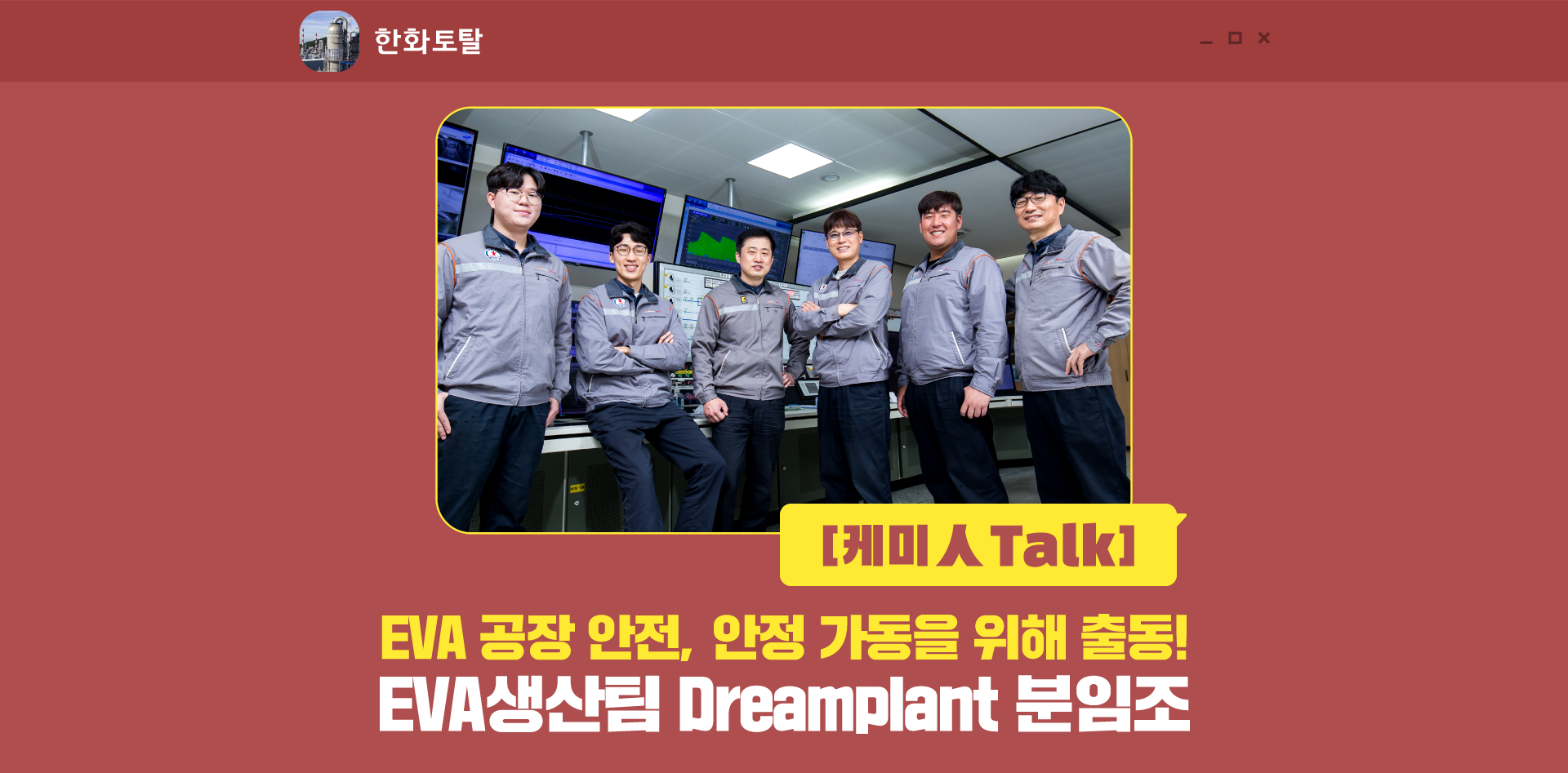 오늘의 케미人Talk은 EVA 공장의 안전과 안정적인 가동, 최고 품질의 제품 생산을 책임지는 Dreamplant 분임조의 이야기를 들어보았습니다. 분임조원들이 서로 소통하고 배려하며 훈훈한 분위기를 자아내는 모습이 전국 품질분임조 경진대회에서 대통령상 금상이라는 빛나는 성과로 나타난 것 같습니다. 앞으로도 도전을 통해 목표를 꼭 이루시길 응원합니다.