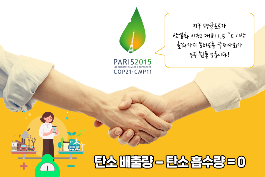 그런데 Net Zero는 무엇을 의미하는 말일까요? Net Zero 란 배출(+)하는 탄소량을 다시 흡수(-)해 실질적인 배출량을 ‘0’으로 만드는 것으로 ‘탄소 중립’이라고도 합니다. 탄소 중립을 달성하기 위한 다양한 제도와 대응방안이 세계 곳곳에서 시도되고 있는데요, 이렇듯 최근 탄소중립이 글로벌 트렌드가 된 배경에는 2021년 본격적으로 시행된 파리 협약이 큰 비중을 차지하고 있습니다.