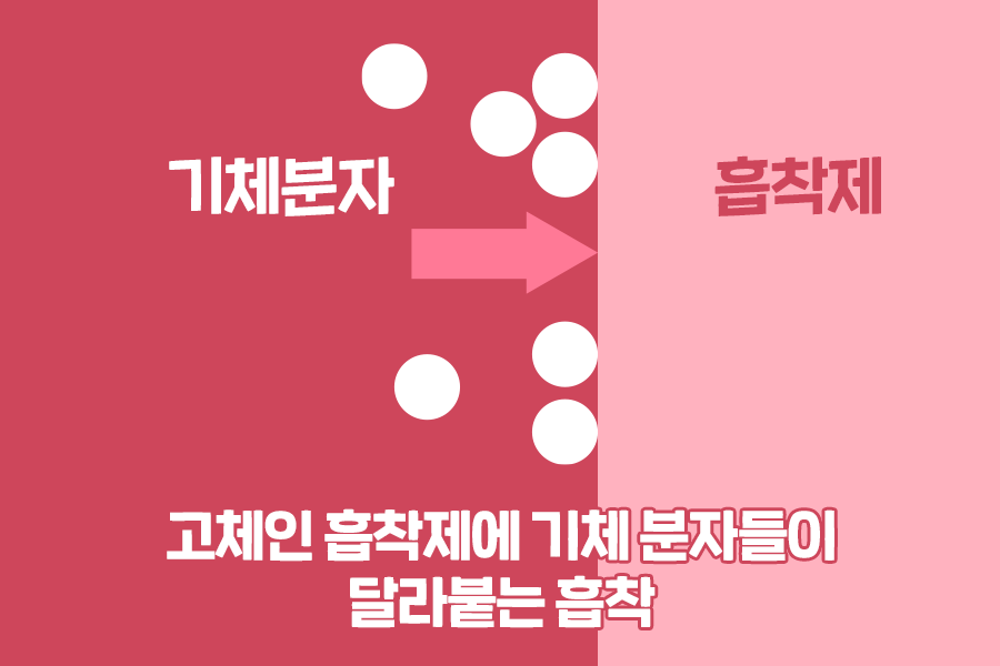 먼저 흡착이란 무엇일까요? 흡착은 기체, 액체, 용해된 상태의 원자, 분자 또는 이온이 고체나 액체 표면에 붙는 과정을 뜻합니다. 흡착이 일어나는 고체를 흡착제라고 하며, 흔히 고체인 흡착제에 기체 분자들이 달라붙는 현상을 흡착이라고 하죠.
