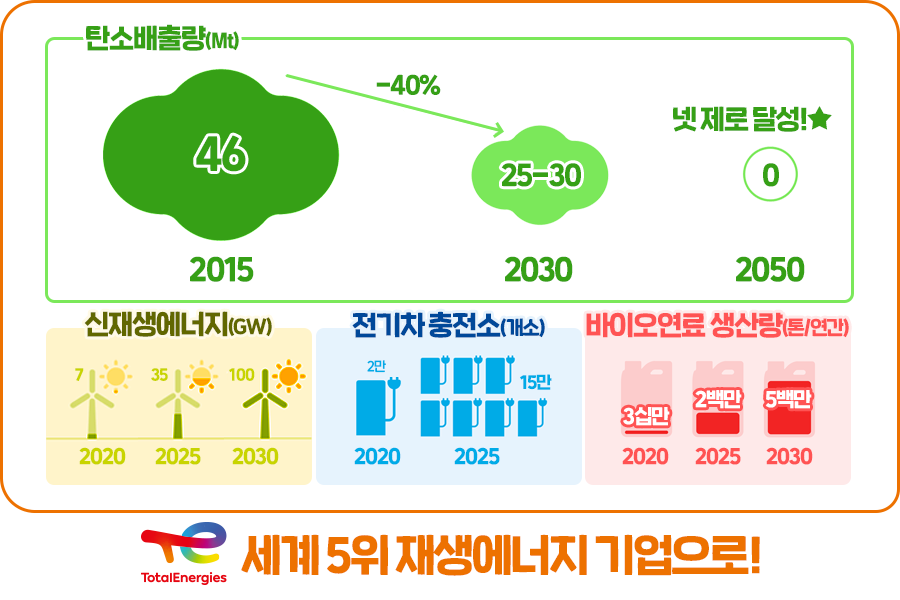 직원 수 10만여 명에, 전 세계 130여 개국 대상 사업 활동을 펼치고 있는 초대형 규모의 토탈에너지스는 탄소중립을 향한 포부 역시 어마어마한데요, 2015년에서 2030년까지 40% 감량, 나아가 2050년에는 탄소배출 넷 제로를 달성하겠다고 발표했습니다.