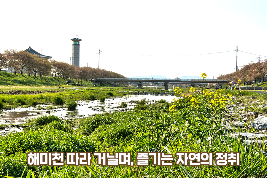 해미읍성과 멀지 않은 곳에서 서산시 해미면을 따라 흐르는 해미천은 걷기 좋은 산책로인데요. 봄에는 벚꽃이 만개하고 여름에는 초록빛이 가득해 자연을 느끼며 여유롭게 거닐기 좋은 곳입니다. 특히 봄에는 ‘해미벚꽃축제’가 열릴 정도로 아름다운 벚꽃 명소이죠. 하지만 코로나19로 3년 연속 축제가 열리지 않았다고 합니다. 아쉽지만 내년을 기약해야겠네요.