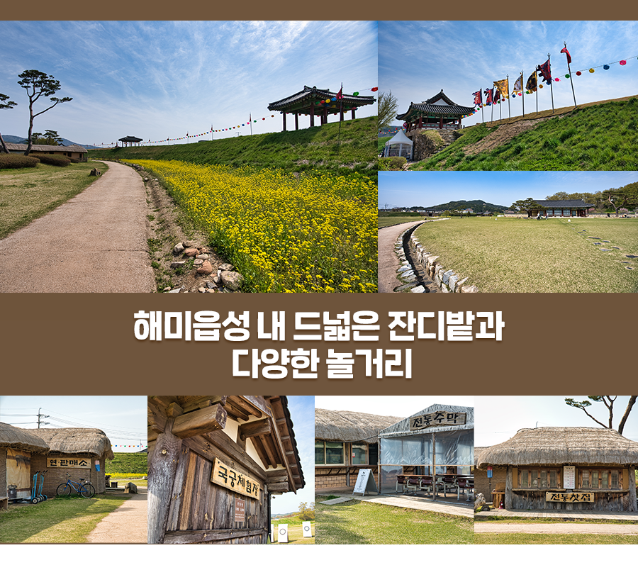 여기서 끝이 아닙니다. 해미읍성의 한편에는 노란 유채꽃이 가득 피어, 샛노란 유채꽃과 푸른 하늘, 그리고 늠름한 성곽이 잘 어우러져 절경을 이루고 있습니다. 유채꽃 가득한 꽃밭에서 사진 한 장은 필수! 인스타그램 피드용 사진을 남겨오시길 바라요.