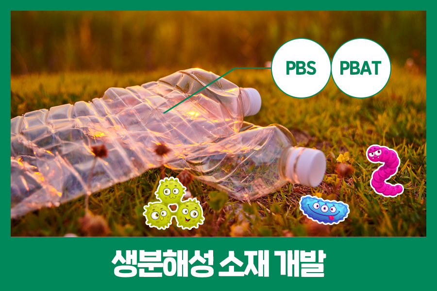 생분해성 소재는 흔히 생각하는 것처럼 꼭 식물로만 만들어진 것은 아닙니다. 고분자가 잘 끊어질 수 있도록 분자구조를 조정한 것이기 때문에 석유로도 만들어진답니다. PBS(Poly Butylene Succinate)나 PBAT(Poly Buthylene co-Adipate co-Terephthalate)등은 대표적인 석유계 생분해 플라스틱입니다. 석유 원료 중에서도 자연에서 발견되는 부탄디올 등의 물질을 합성해 만드는 것으로 특별한 조건 없이도 토양에서 생분해될 수 있습니다.