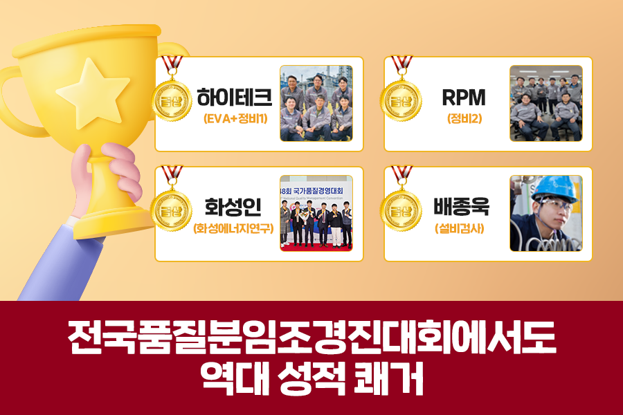 화성에너지연구팀 화성인 분임조가 안전품질 부문, EVA생산팀과 정비1팀 연합 하이테크 분임조가 현장개선 부문, 정비2팀 RPM 분임조가 보전경영 부문, 설비검사팀 배종욱 주임이 제안사례 부문에서 모두 금상을 수상했습니다.