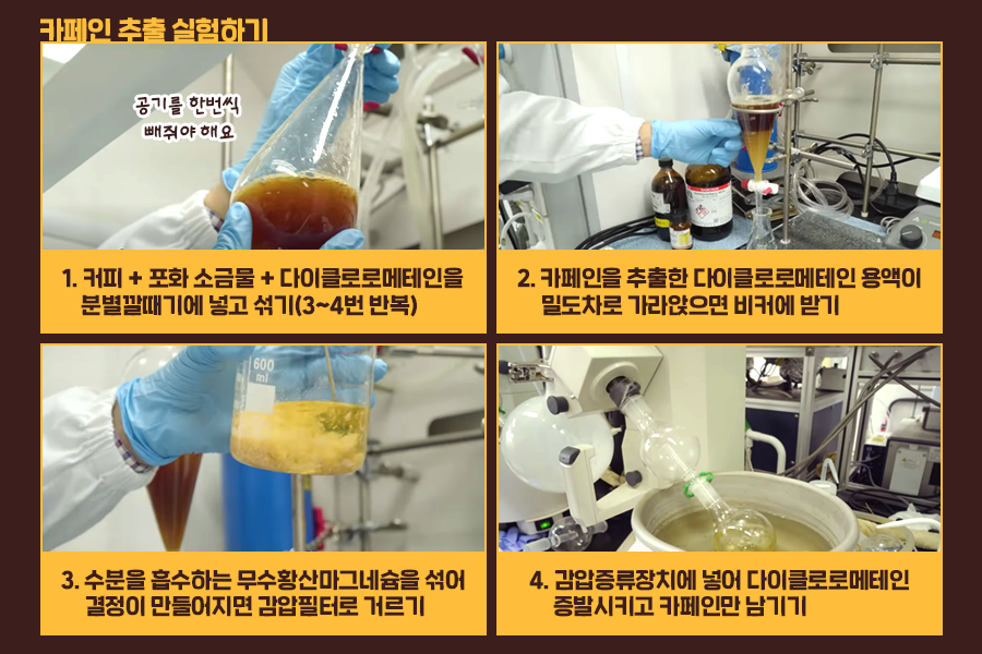 결정과 용매를 분별해냈고, 실험이 이상적으로 진행되었다면 우리는 다이클로로메테인에 아이스 아메리카노 한 잔 분량의 카페인을 완벽하게 추출해내는데 성공한 것입니다. 이제 남은 다이클로로메테인을 기화시키게 되면 카페인만 남길 수 있습니다.