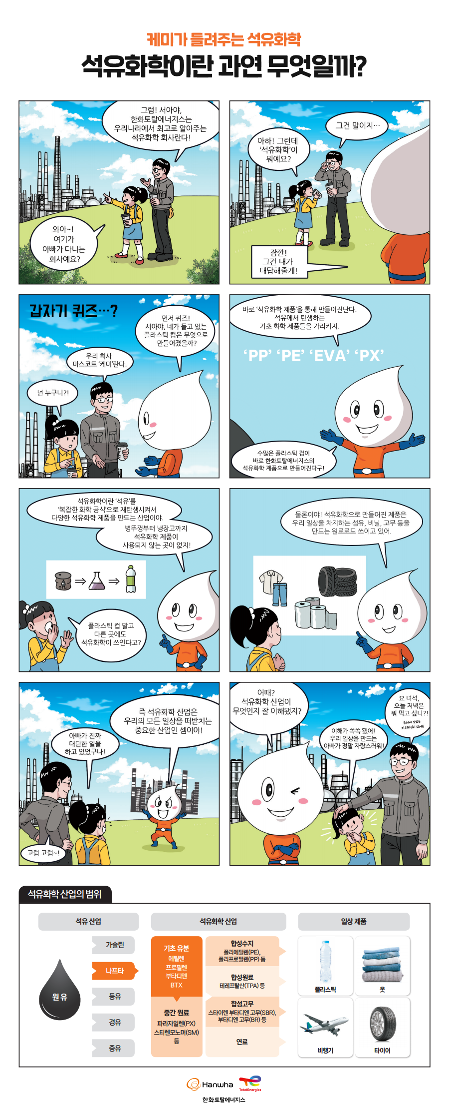안녕하세요, 블로그 지기입니다! 여러분은 석유화학을 생각하면 무엇이 먼저 떠오르시나요? 경유, 휘발유와 같은 기름? 수증기가 피어나는 커다란 공장? 석유화학은 과연 무엇을 만들고 우리 삶에 어떤 영향을 주는 걸까요? 한화토탈에너지스의 마스코트 ‘케미’와 함께 알아보아요~