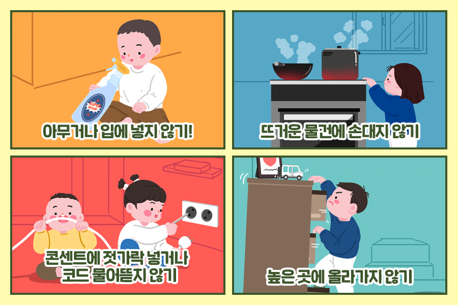 생활 속에서 언제든 위험에 노출되어 있고 새로운 것을 탐구하기 바쁜 어린이들은 안전에 특히 유의해야 하는데요. 가장 빈번하게 일어나는 사고를 중심으로 어린이들을 위한 몇가지 안전 수칙을 알아보겠습니다. 물론 아이들이 이러한 위험 행동을 하지 못하도록 보호자인 어른들이 먼저 알고 주시하고 있어야겠죠?