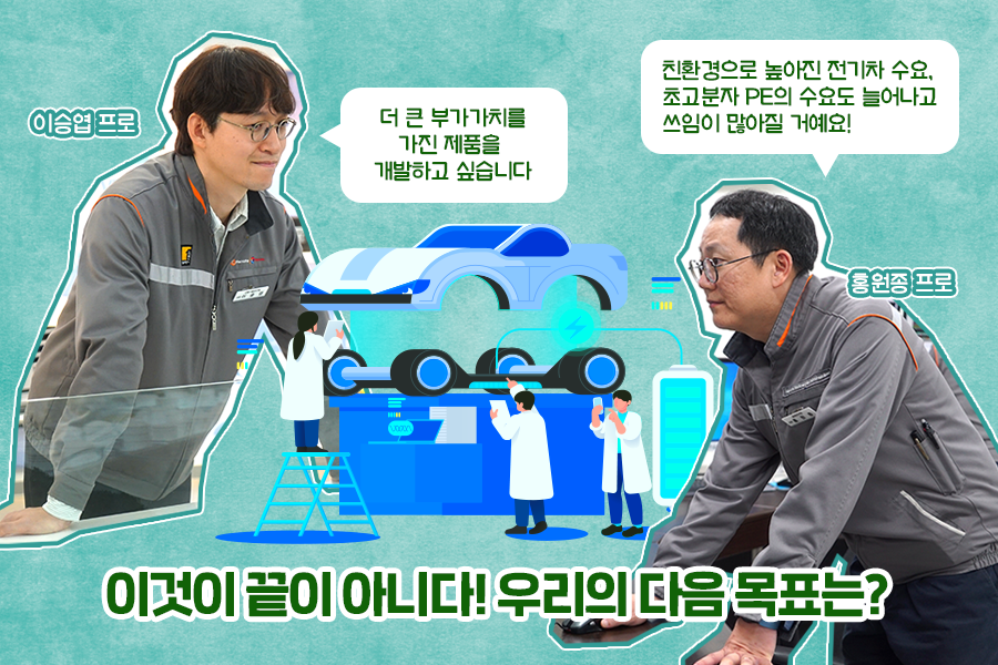 홍원종 프로: “최근 CO2 등 환경 문제가 많잖아요. 전세계적으로 전기 에너지를 사용하려는 움직임이 늘어나면서 전기차의 수요도 커졌고요. 이 때문에 배터리의 수요도, 배터리에 사용되는 이차 전지와 PE제품의 수요도 커질 것입니다. 저희가 개발한 소재도 수요가 증가해 더 많은 생산과 쓰임이 있기를 바랍니다.”