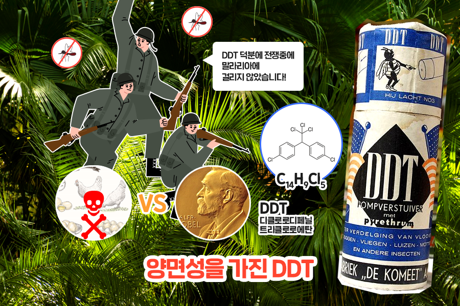 제2차 세계대전 당시 곤충이 많은 열대지방에서 전투가 많이 일어났는데, 이때 질병을 옮기는 벌레를 박멸하기 위해 이 DDT가 사용기 시작했죠. 이후 말라리아 모기를 퇴치하기 위해 지중해 지역에서 사용된 DDT를 발명한 뮐러 박사는 노벨 생리의학상도 수여 받게 되었습니다.