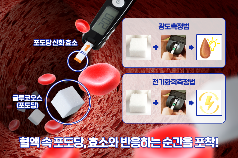혈당 측정은 크게 ‘광도측정법’과 ‘전기화학측정법’으로 나뉘는데요. 광도측정법은 포도당과 효소가 반응하는 과정에서 생성되는 중간물질이 염료와 만나 색이 변하면 빛을 쪼여 혈당을 측정하는 방식입니다. 전기화학측정법은 포도당과 효소가 반응하는 과정에서 발생하는 전자를 이용하는 방식인데, 전자를 전극으로 전달할 때 흐르는 전류의 양을 측정해 혈당량을 파악하는 원리입니다.