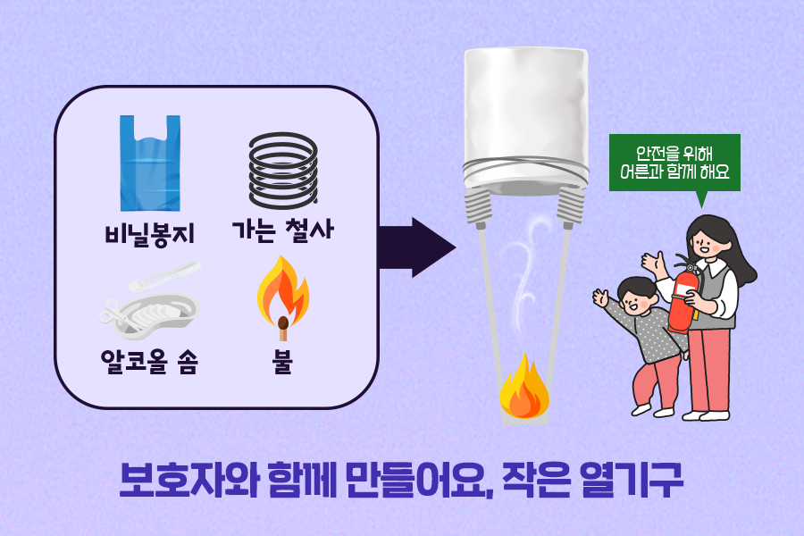 작은 열기구 만들기 실험은 알코올 솜과 불을 사용하기 때문에 안전에 특히 유의해야 하며 어린이의 경우 반드시 어른의 도움이 필요합니다. 주변 인화성 물질을 치우고, 알코올 솜을 적당히 짜내어 화재를 예방하고 소화기나 물을 준비해 안전한 실험을 하시기 바랍니다. 가급적 실내보다는 바람 불지 않는 날 실외에서의 실험을 추천드립니다.