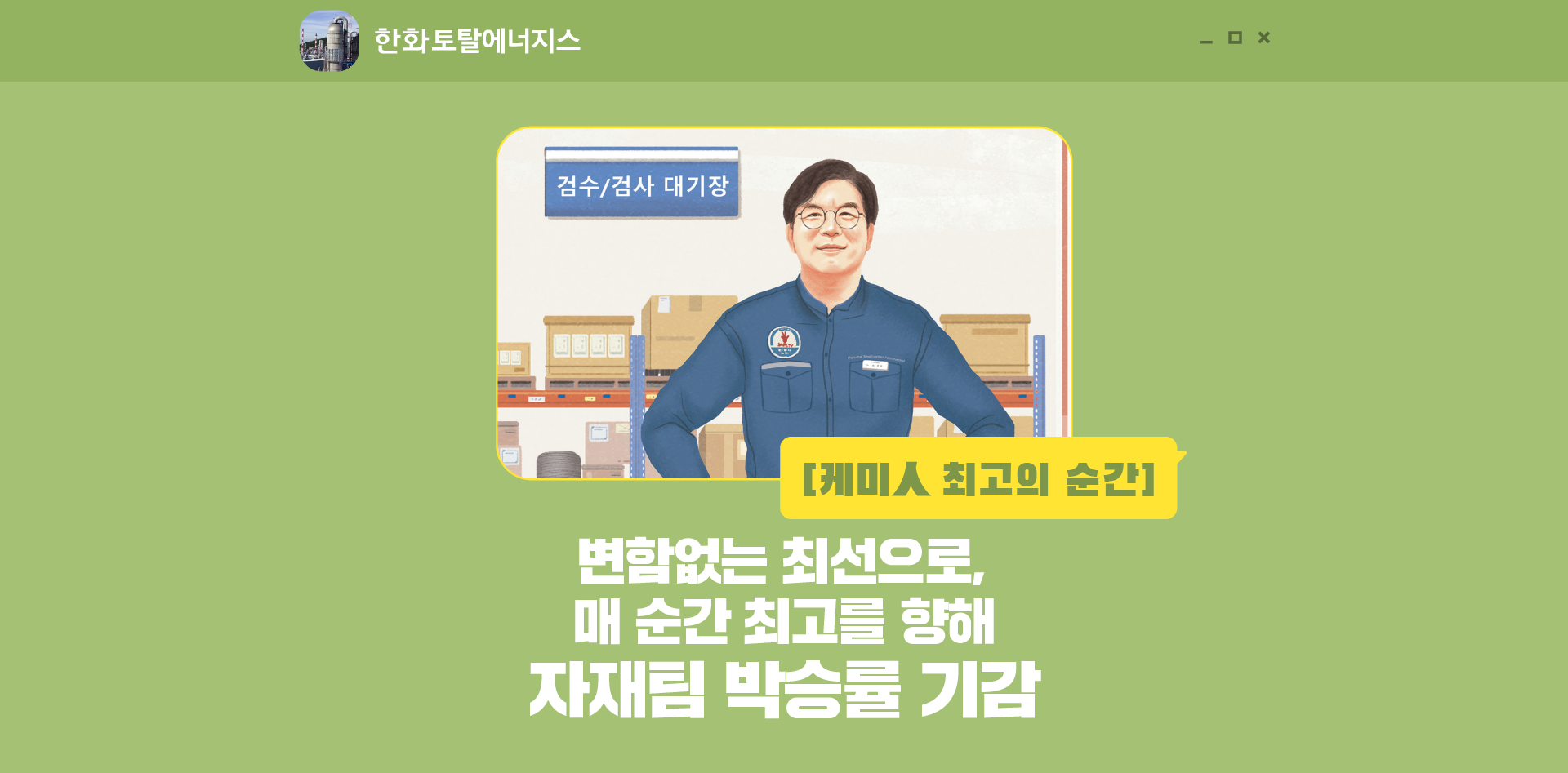 인기 드라마 ‘도깨비’에는 ‘날이 좋아서, 날이 좋지 않아서, 날이 적당해서 모든 날이 좋았다’ 라는 명대사가 나옵니다. 한화토탈에너지스 최고의 순간을 인터뷰할 때 대부분은 어느 한 순간, 찬란히 빛나던 그 순간을 떠올리는데요. 오늘 만나볼 자재팀 박승률 기감은 모든 날, 모든 순간이 최고였다고 말합니다. 박승률 기감의 모든 날이 과연 어땠기에, 모든 순간이 최고일 수 있었을까요? 함께 알아보아요~